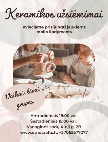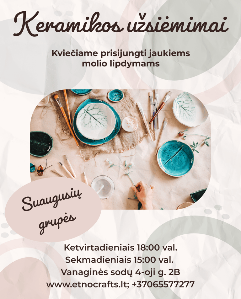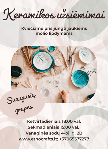Užsiėmimuose laukiame visų, kurie nori kūrybiškai ir jaukiai praleisti savo laisvalaikį ir nusipildyti molio dirbinį sau, dovanų savo artimiesiems arba draugams.